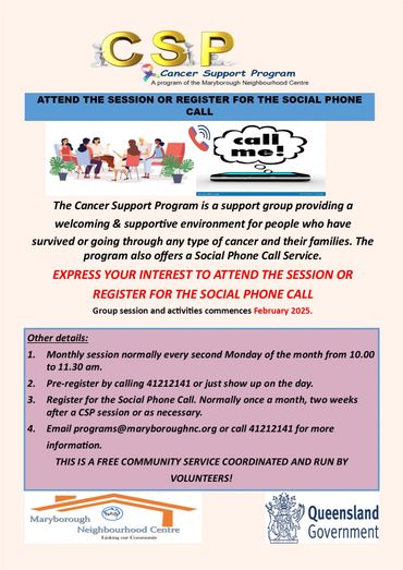 Flyers for upcoming, current events and programs at the centre. This page is updated regularly. For more information call the centre on 07 4121 2141, email us at programs@maryboroughnc.org or see reception at 25 Ellena Street Maryborough.